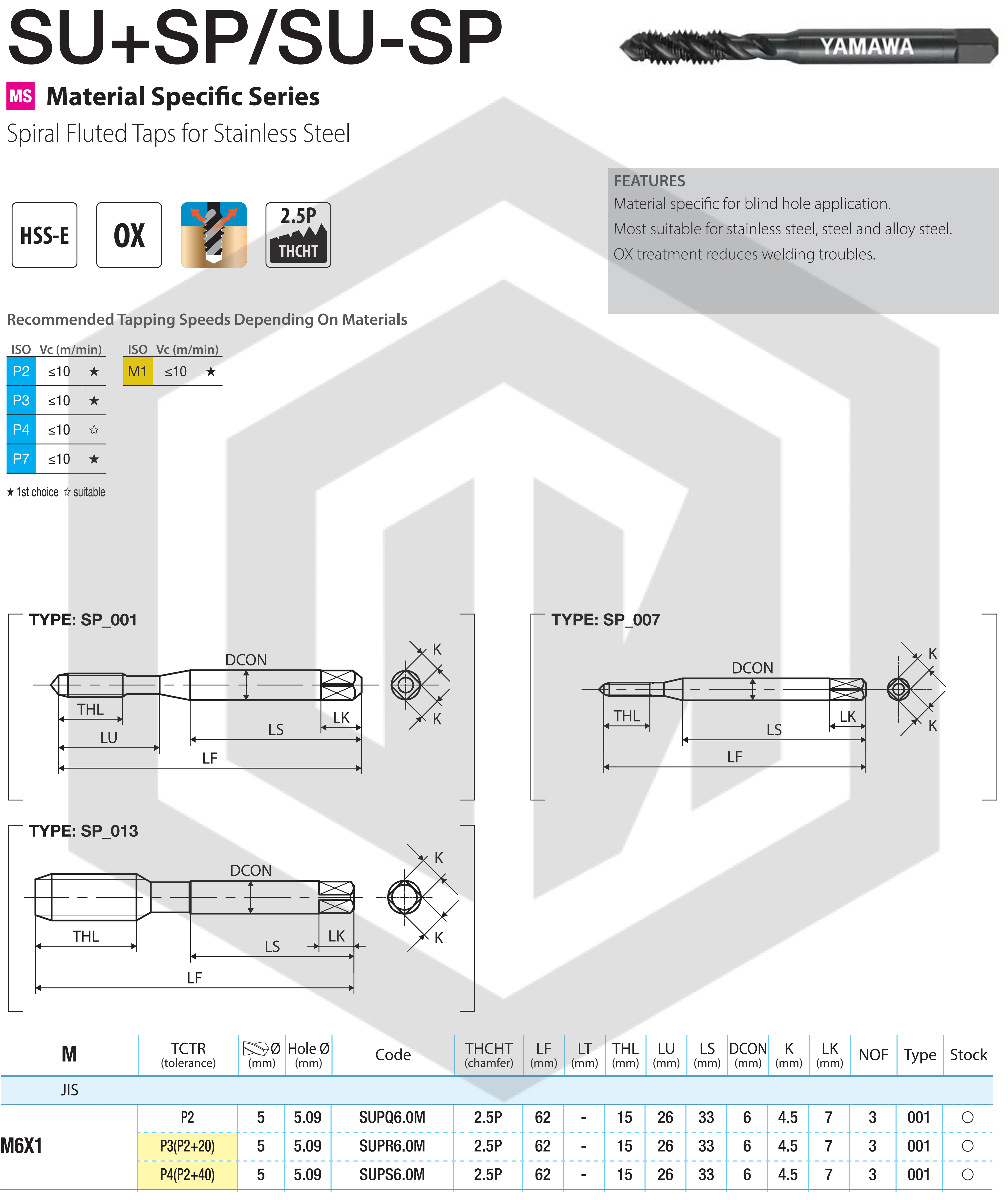 Метчик машинный SU+SP M6*1.0 с винтовой канавкой, для метрической резьбы M6 с шагом 1 мм, класс точности P2. Соответствие стандарту JIS 154 гарантирует стабильность размеров и совместимость.