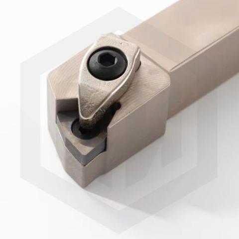 Токарная державка с главным углом в плане 95° и системой крепления типа D (прижимом сверху за отверстие в пластине).
